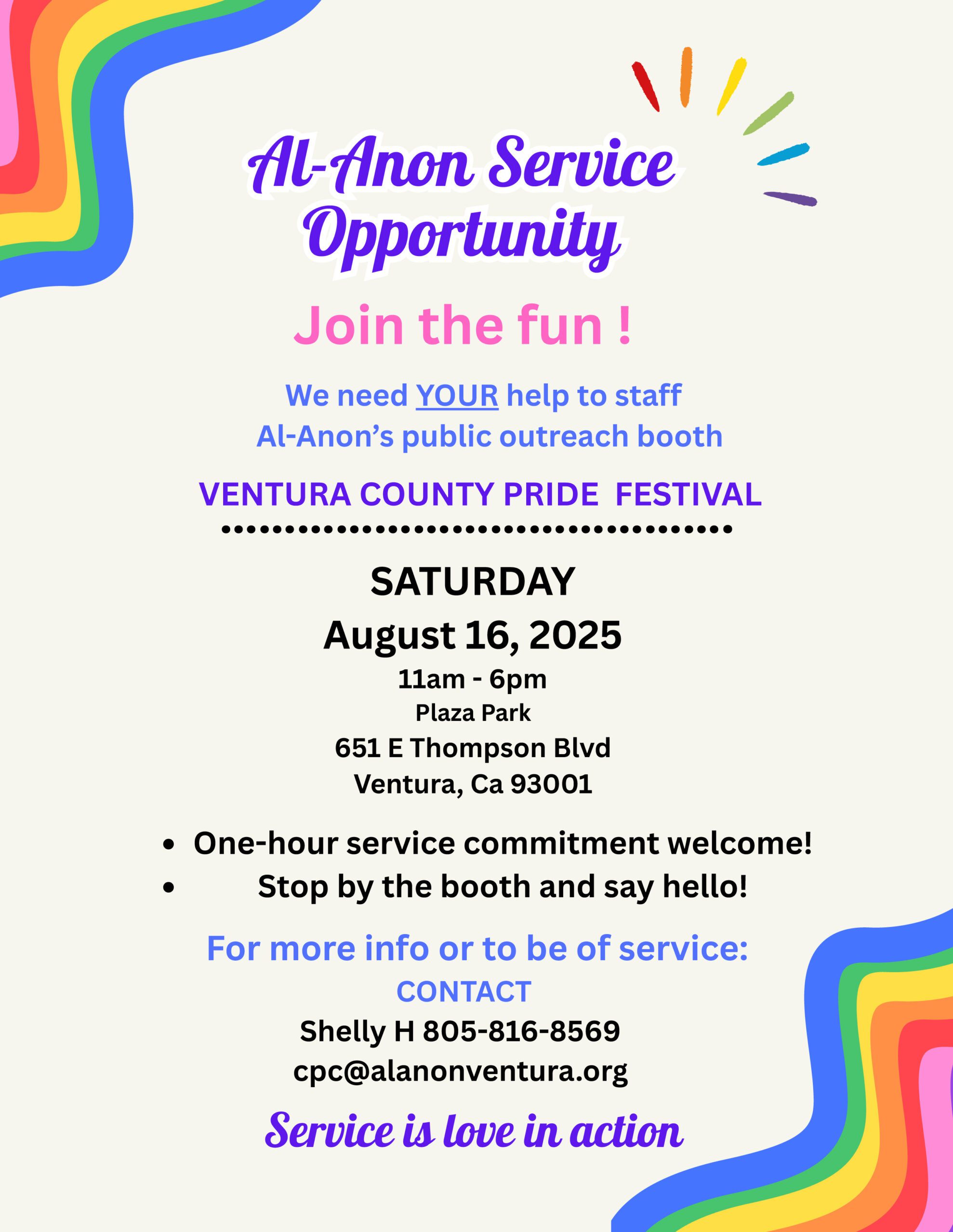 VOLUNTEERS NEEDED for the Ventura County Pride Festival Saturday, August 16, 2025 from 11am - 6pm 651 E Thomspon Blvd, Ventura, CA 93001 CLICK HERE FOR DETAILS For more info contact Shelly @ 805-816-8569