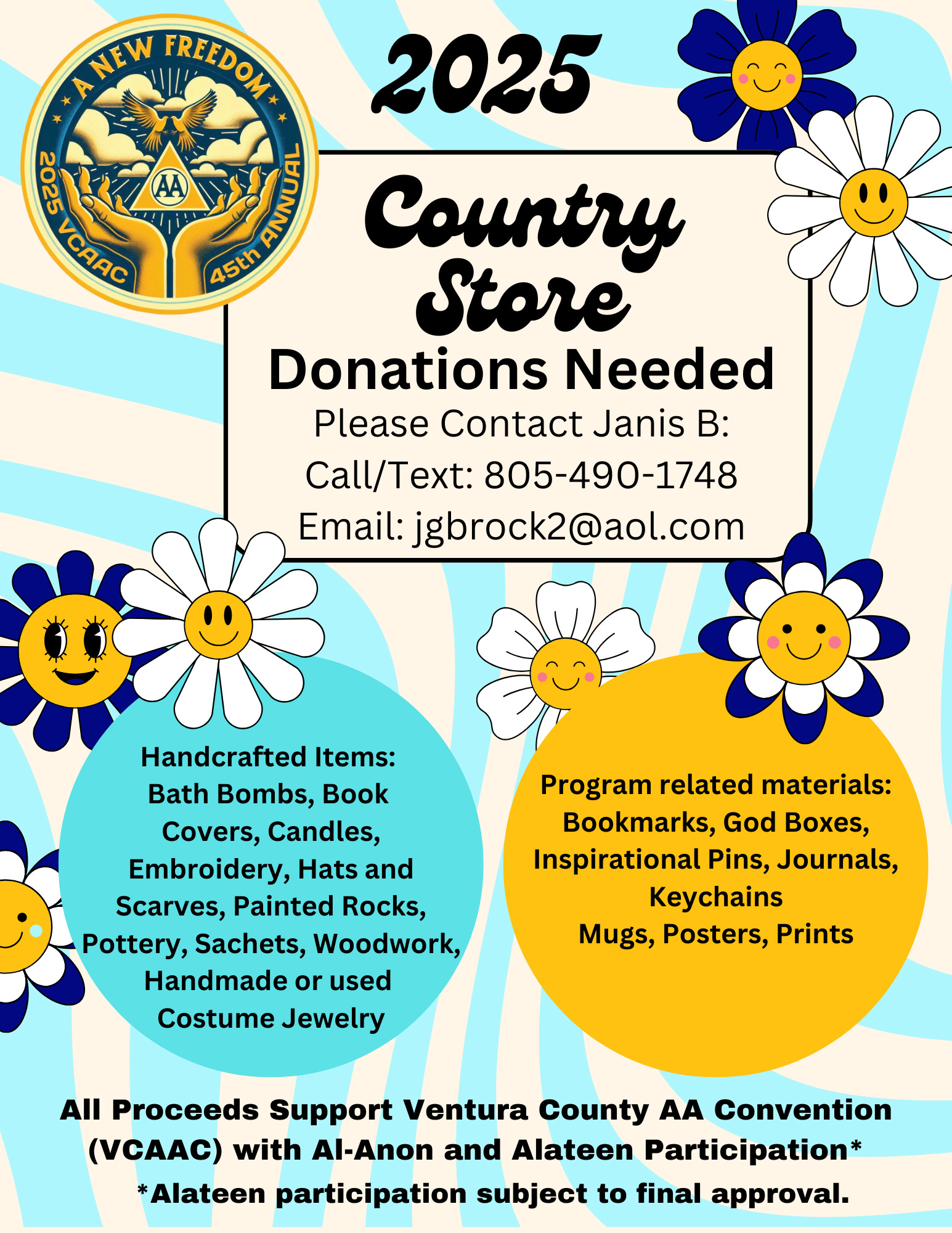 DONATIONS NEEDED for the 2025 Ventura County AA Convention Country Store 2025 Ventura County AA Convention September 5, 6, 7 Hyatt Regency, Westlake Village, CA Handcrafted Items and Program Related Materials CLICK HERE FOR INFO Contact Janis B. to Donate 805-490-1748